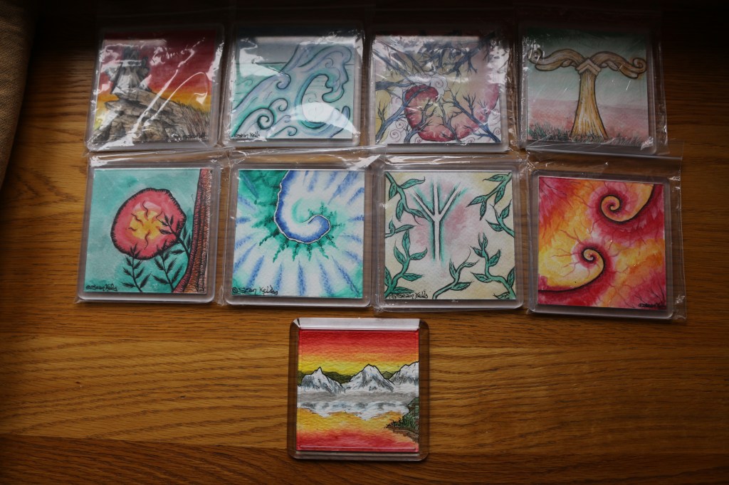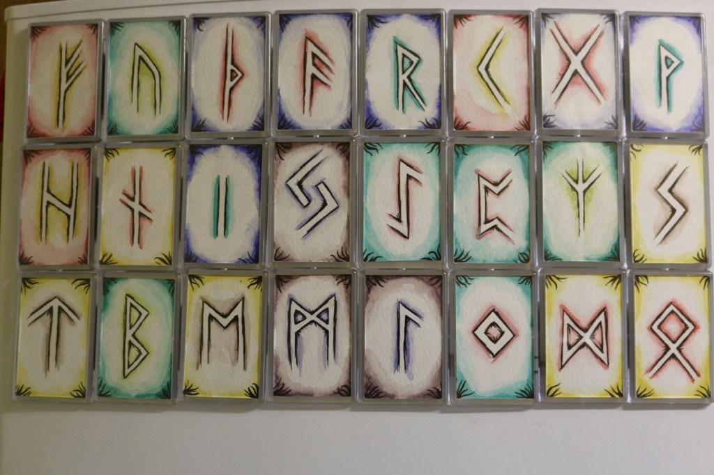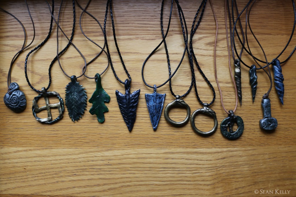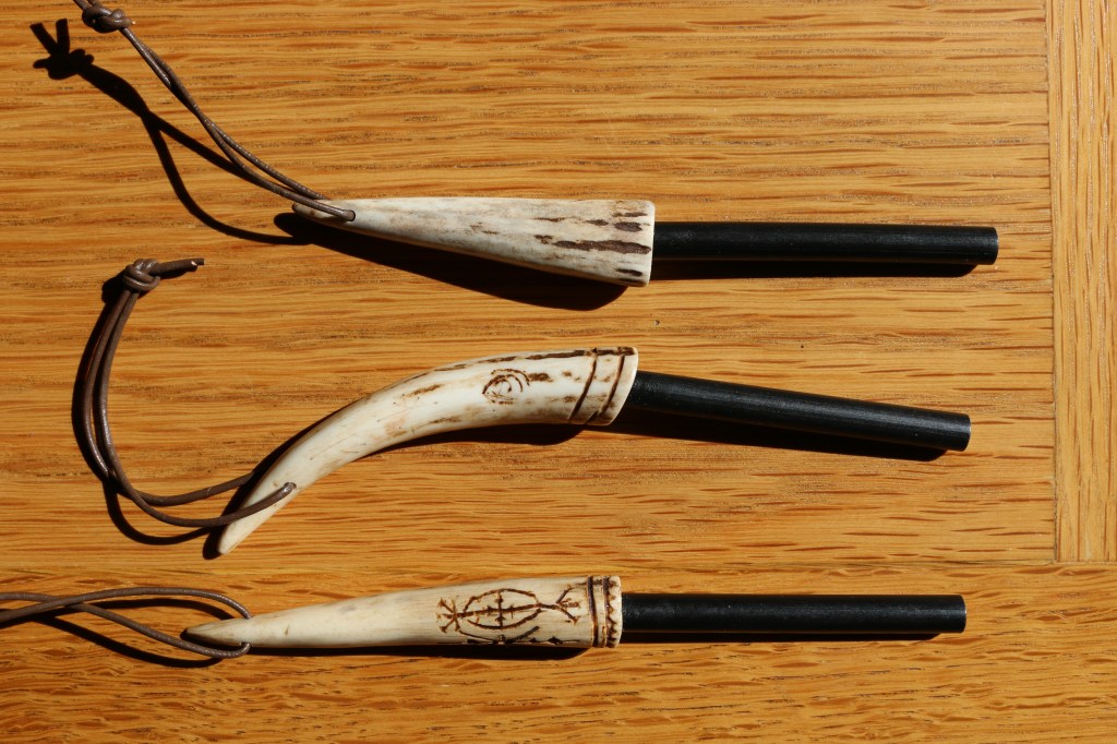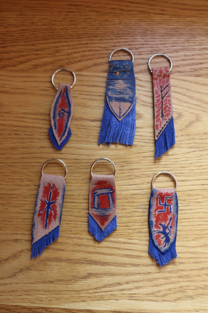 Doll’s House Victorian Screen (William Morris design), on oakPolymer clay Yule decoration (goat)Polymer clay pendantsPolymer clay yule decorationKnife sheath I made for myself years ago using leather, wax cord and pyrographyBelt pouch I made for myself years ago using leather, wax cord and pyrographyLeather keyringsPainted keyrings (both sides)Painted rune fridge magnetsPainted coasters (reversible)Engraved sherry glassEngraved whisky glassPainted glass votive holdersPainted ceramic Yule mugCarved antler ferrocerium rod for lighting fires – My most ambitious pumpkin carving so far, 2019 (carved woodland on reverse)Turned goblet in yew, 2015
